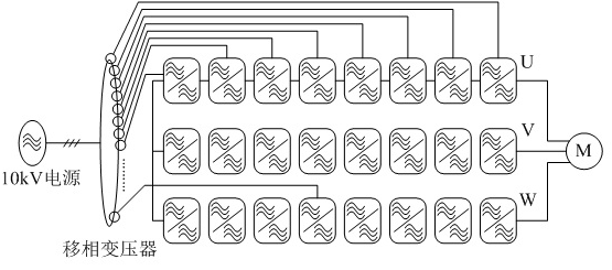 高压变频器从10kV电网取电,经过内部移相变压器降压、移相、隔离输送给各个功率单元,功率单元从原理上等效于一个三相交流输入、单相交流输出的低压变频器。电路结构如下图3所示: